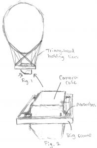 I also had an idea for the rig, although to be honest I don’t think it will work and will only add extra weight to the balloon. I was thinking of maybe making the box out of Polystyrene and placing a frame around it, so that it is easily attachable to the balloon (fig. 2). The frame would also have absorbers, so that if it lands on its side, they will take most of the impact. But just thinking about it now, I wouldn’t want the rig landing on its side anyway in which case that would be unnecessary.