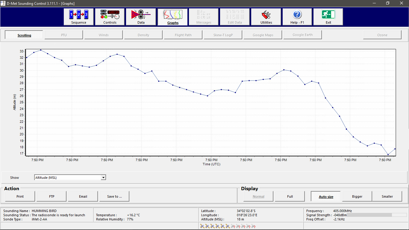 When the radiosonde had fallen behind the mountains on the horizon, we lost track of them as the signal was not strong enough to penetrate the mountain. With that the tracking sequence was terminated and I had my first real data to experiment with. When I installed the software, Michael didn’t think it would be able to track past the balloon burst, as they had never done it before, but the software handled it perfectly and it was a big success.
